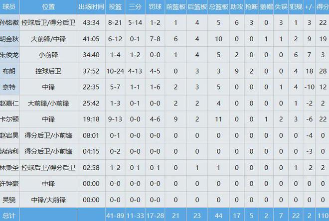 广厦队那边5人得分上双,其中三人得分20+,孙铭徽绝对是赢球的最大功臣,次节大比分落后情况下是他连突带投率队死死咬住比分,才有最后的胜局。