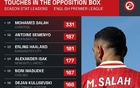 萨拉赫本赛季英超对方禁区内触球331次,比其他人多至少144次