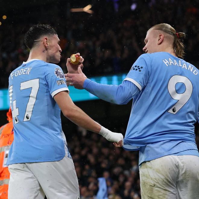 英超第11轮,曼城主场3-0大胜利物浦,除了进球外,本场比赛还出现了有趣一幕,哈兰德和福登在比赛期间吃了看台扔下来的苹果。